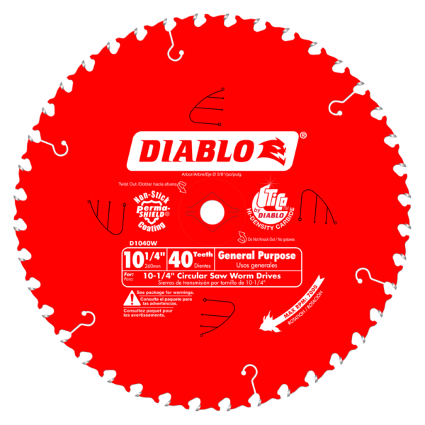 Diablo’s 1-1/4″ General Purpose beam saw blade is specifically designed for use on a wormdrive saw (5/8″ diamond knockout). Cuts 4x headers and fence posts, 2x sandwiched headers, exposed beams for decks and porches and 7 sheets of 1/2″ plywood with one pass.
