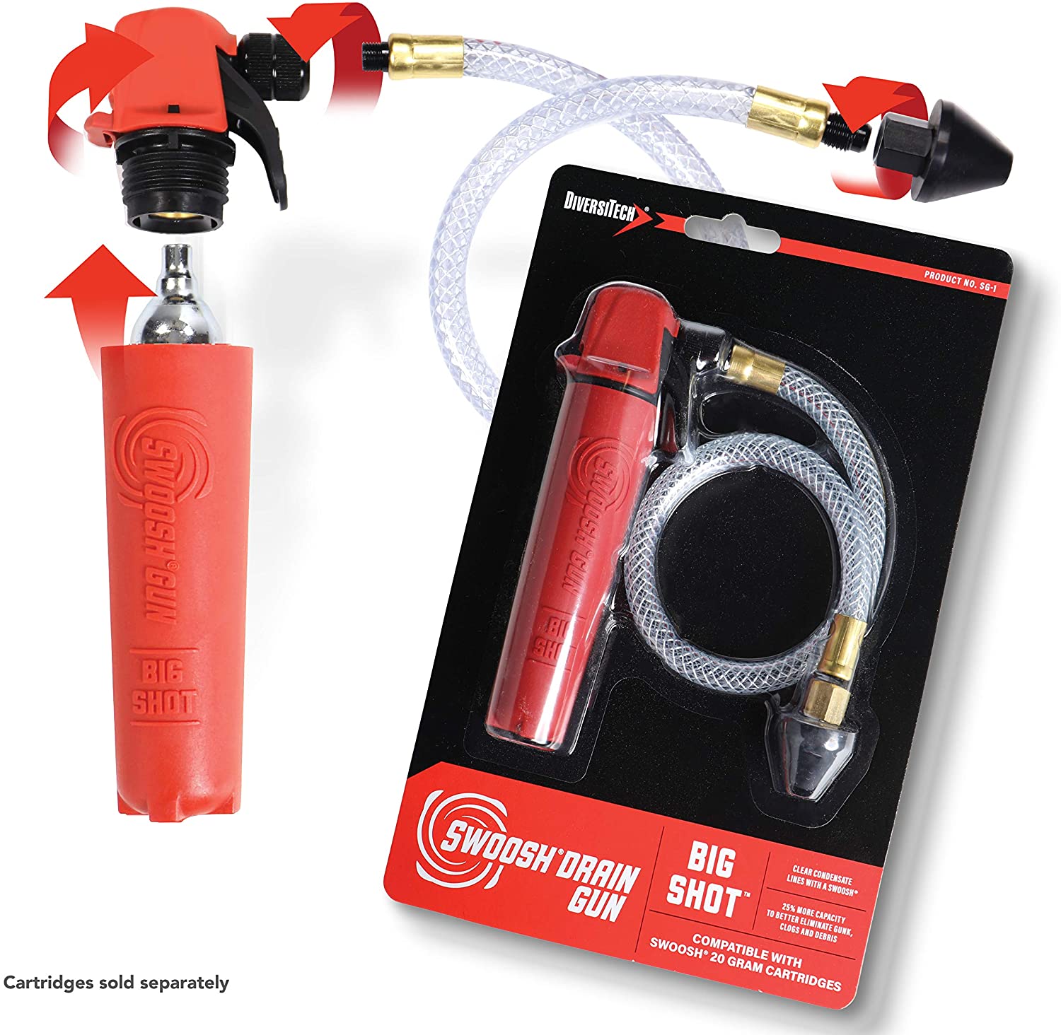 The SWOOSH® Drain Gun is designed to blow out drain lines instantly. New larger 20 gram SWOOSH CO2 cartridges deliver 800 PSI of oil free air to clear the line, with 25% more capacity. Each unit comes equipped with a tapered fitting to work on 3/8in. – 3/4in. drain openings. Flexible hose assembly maneuvers through cabinets, coils and hard to reach drains. Reduces labor costs and time on service calls.