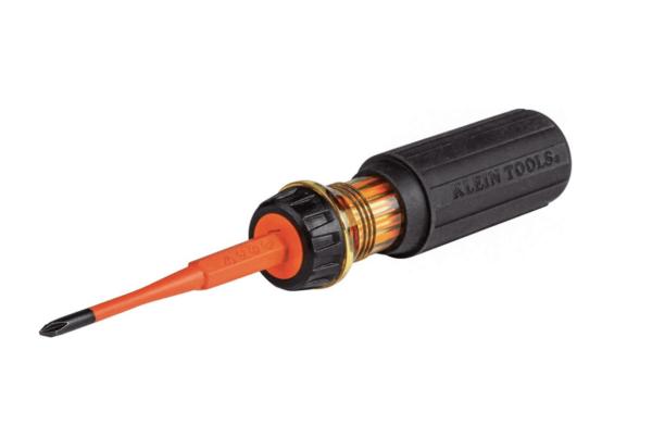 Klein Tools’ Flip-Blade Insulated Screwdriver is two drivers in one tool. The auto-eject mechanism works with just a twist, allowing you to flip the #1 Phillips- to the 3/16-Inch Slotted-end of the blade simply and easily.