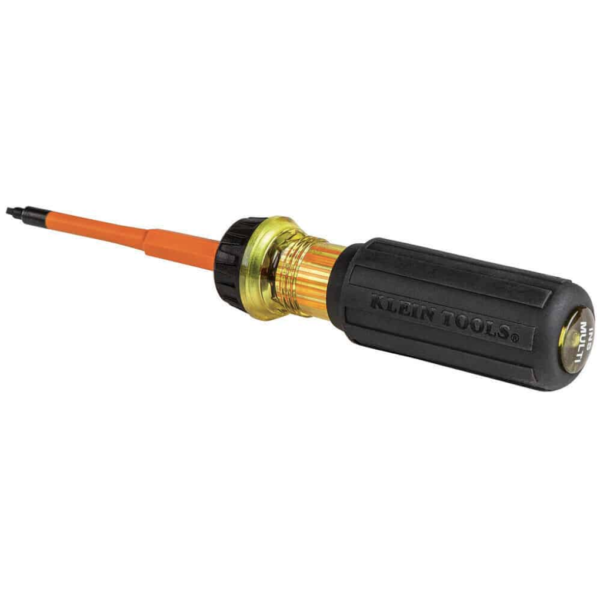 Klein Tools’ Flip-Blade Insulated Screwdriver is two drivers in one tool. The auto-eject mechanism works with just a twist, allowing you to flip the #2 Square- to the #1 Square-end of the blade simply and easily. A bright orange coating of insulation protects from electrical shock, as well as being flame and impact resistant. Klein insulated tools exceed the ASTM F1505 standards for insulated tools, and are clearly marked with the official 1000-Volt rating symbol.
